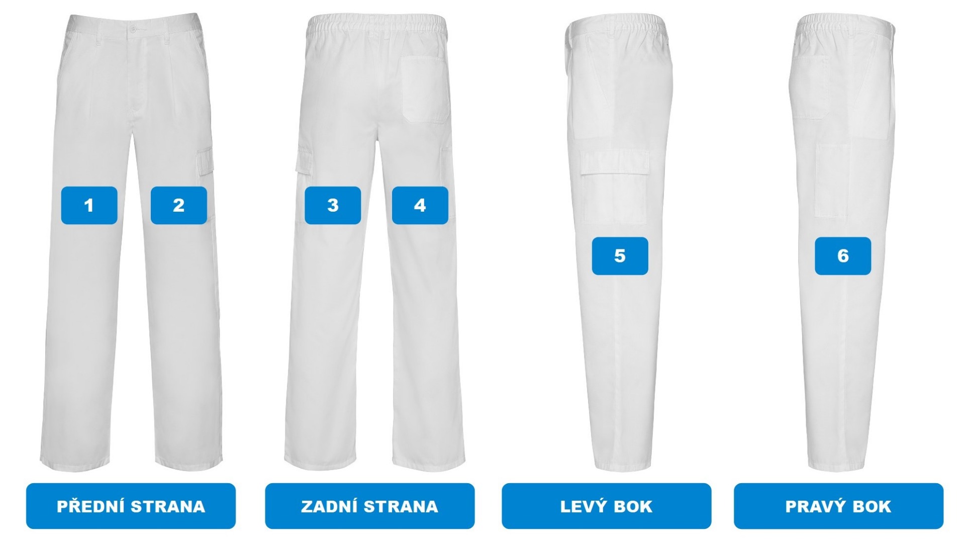 - Pracovní kalhoty s odolné látky se dvěma předními kapsami a zadní funkční kapsou.