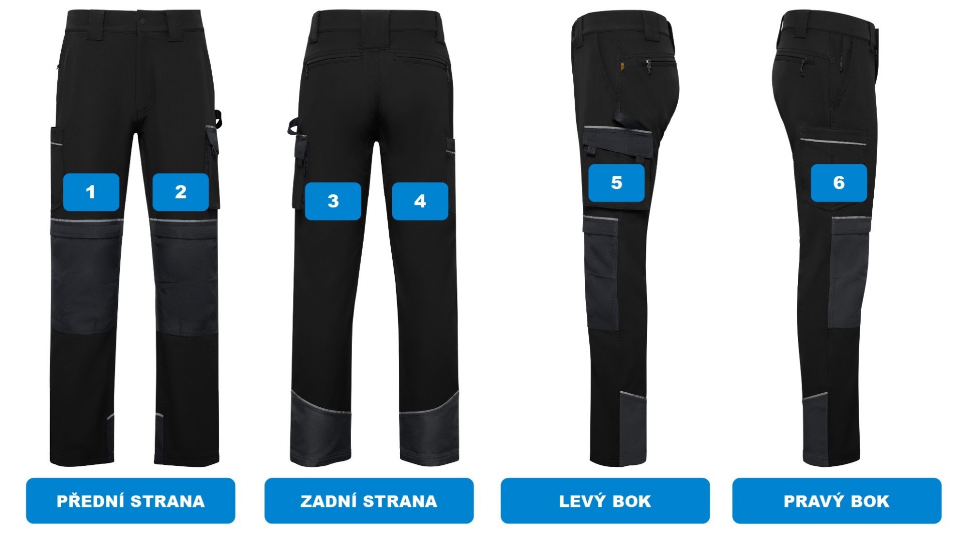 - Strečové pracovní kalhoty s více kapsami. Pas se dvěma předními a třemi zadními poutky na opasek se středovým poutkem zvláštní šířky.
