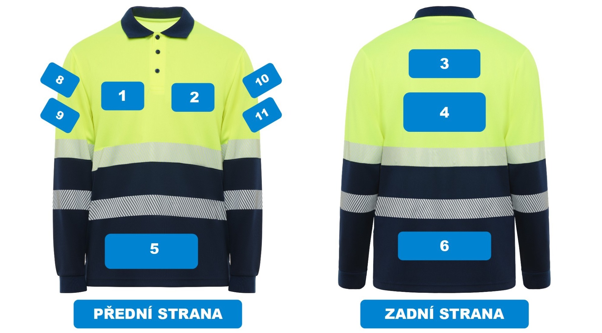 - Pánská reflexní polokošile s dlouhým rukávem se zapínám na 3 knoflíky. Dva vodorovné reflexní pruhy na hrudi a zádech. Žebrovaná látka límce.